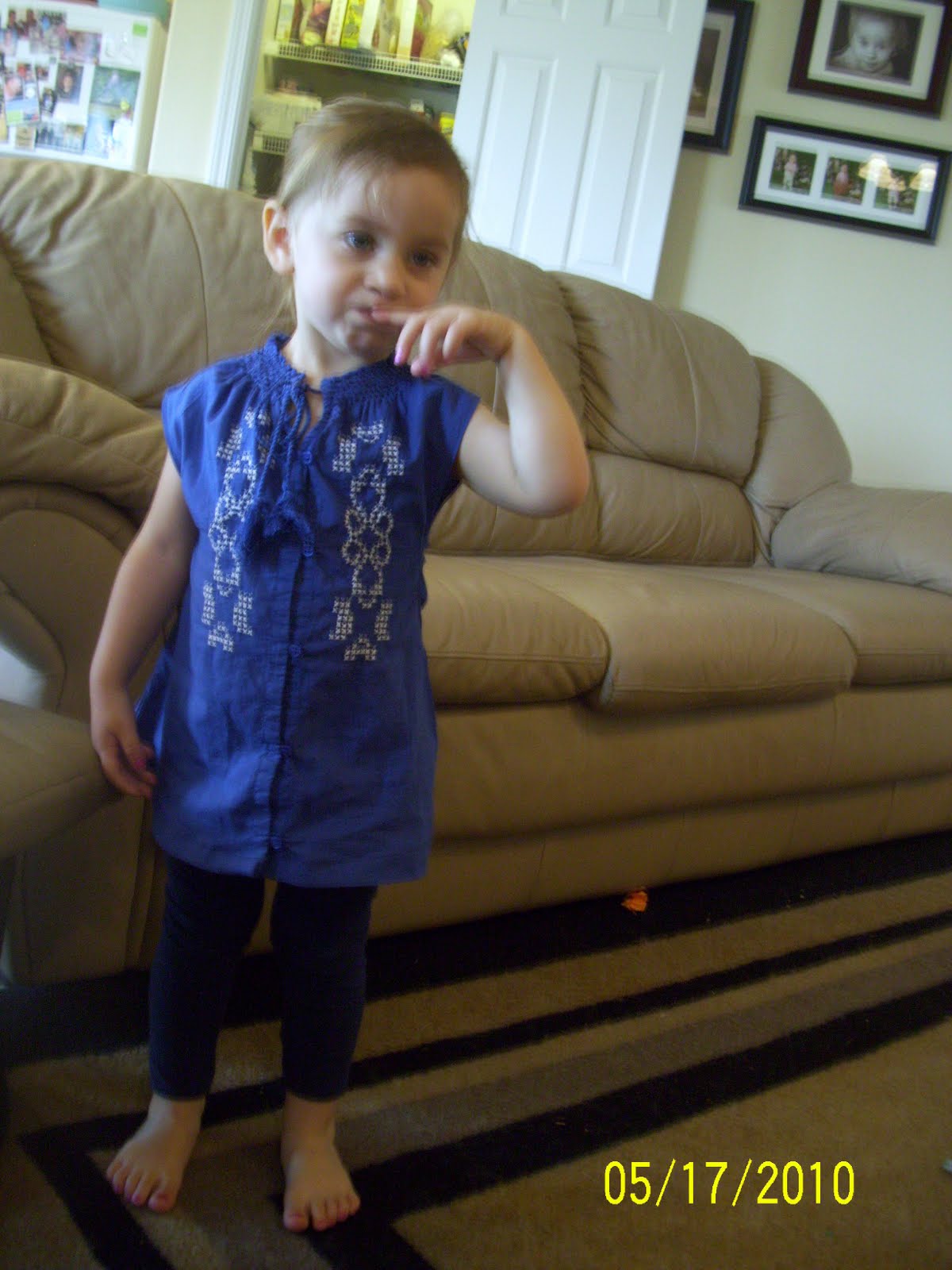 This is not the greatest picture of Emersyn, but I love it because she is showing me her pretty pink nails. She has been showing them off for a couple of days now--she is pretty proud. The picture also gives you a great view of my pantry--yep--not clean:) Anyway....yesterday I spent a little time with my sewing machine. It has not gotten a lot of attention lately so I cranked it up and did a little re-fashion.